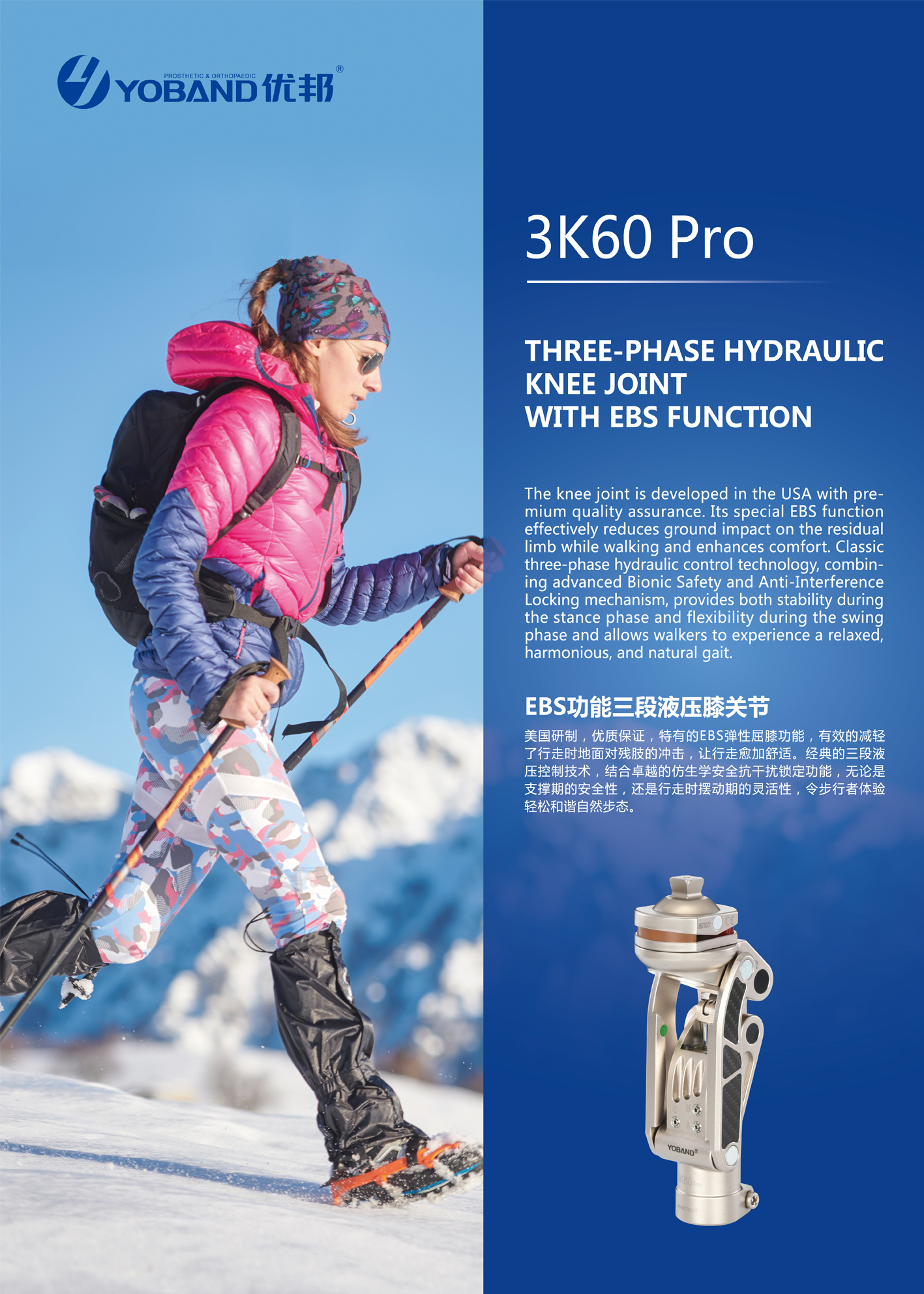 ◆The knee joint features original imported INA sealed needle roller bearings, significantly extending its service life more than three times that of standard knee joints. ◆Anti-interference lock three-stage hydraulic knee joint is developed by the United States, with high-quality guarantee. The classic three-stage hydraulic control technology combines the bionic safety anti-interference locking function. Both the safety of its support period and the flexibility of its swing period during walking can make the walker experience the "real leg" feeling that he has never experienced before. ◆Three-stage hydraulic control technology. A: The damping of the angle between the extended position of 60 and the complete knee flexion can be adjusted. B: Knee flexion damping can be adjusted between 0-60°in the extension position. C: The stability of full knee extension is adjustable. Threestage hydraulic adjustment function is suitable for amputees with various special limb conditions and ages. ◆The upgraded anti-interference lock is a bionic design, with lightweight structure and delicate shape. It can provide excellent stability and safety on various rugged roads, which allows patients to walk freely. It is no longer a dream for patients with double thigh amputations and blind amputees to walk easily. ◆The knee bending connector has an ultra-thin design, which is an ideal choice for amputees with ultra-long residual limbs and knee joint disconnection.The knee bending angle can be designed up to 150°. Wearing it, people look like ordinary people when sitting and standing, even squatting, cycling and other daily activities will not be limited. ◆The unique double EBS function help achieve easy and smooth down slope walking in sophisticated road and eliminate the ground shocking to the residual limbs, making the walking more comfortable. ◆A multi-axial design extends the service life of the knee joint. ◆The four-pyramid connecting plate on the movable knee can be adjusted and translated to the human gravity line+/-5MM. |