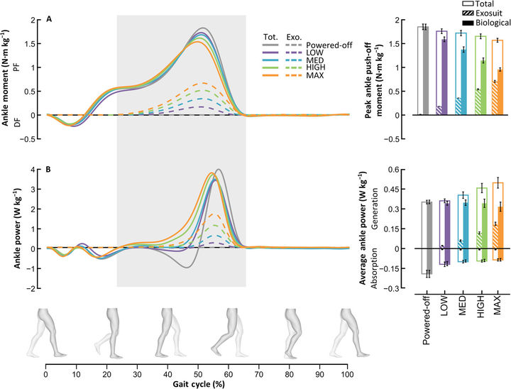 然后我们比较脚踝关节的动量和能量大小(如下图)。我们发现,柔性外骨骼的辅助比越大,人本身的关节力矩和做功相应更小,因此总力矩和总做功也就更小。