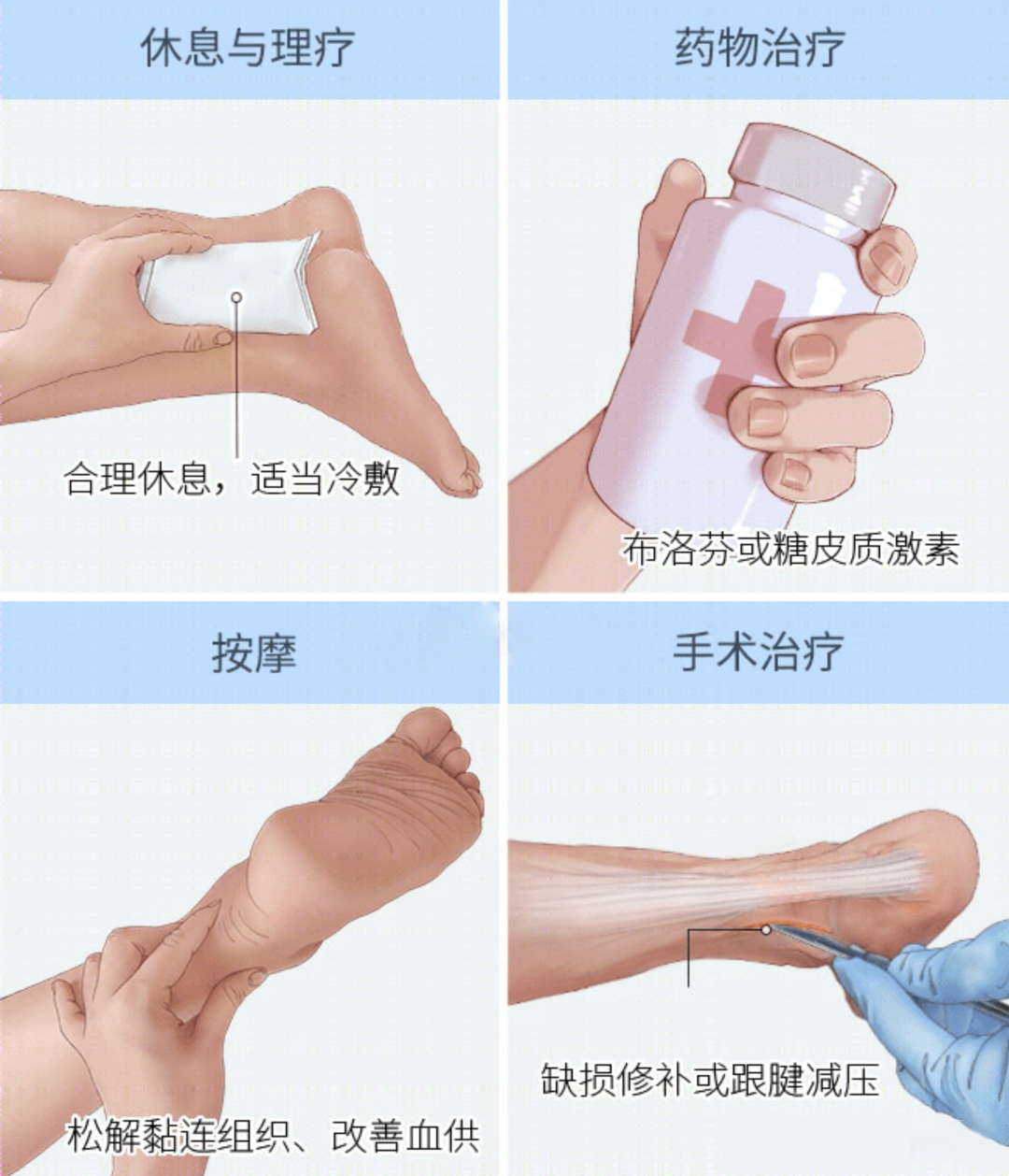 非手术治疗(包括物理治疗)能够使跟腱炎在几周时间内得到痊愈和自我修复。如治疗没有效果,需要做手术来切除跟腱周围的炎症组织。
